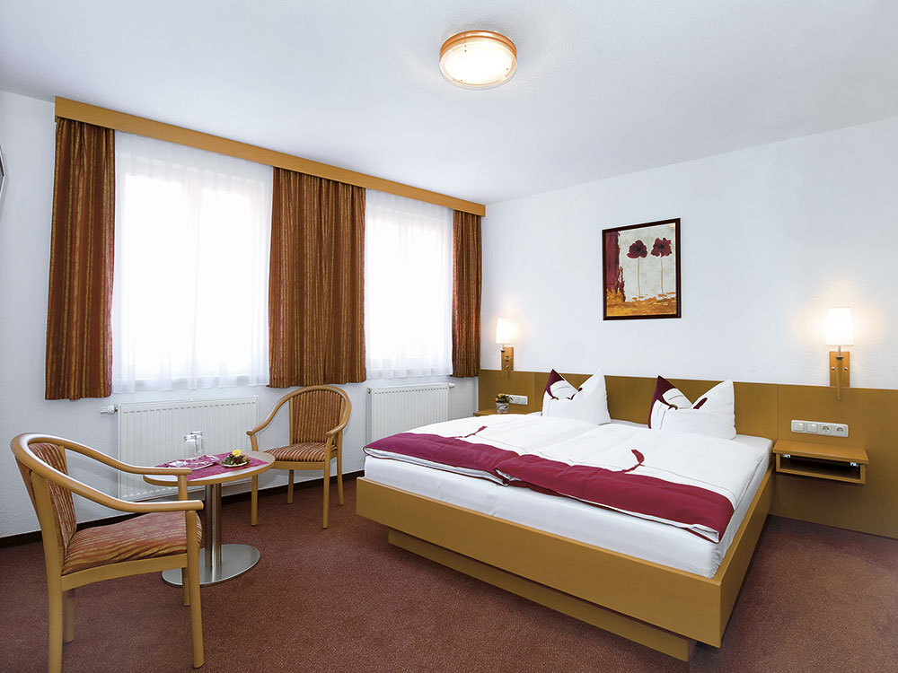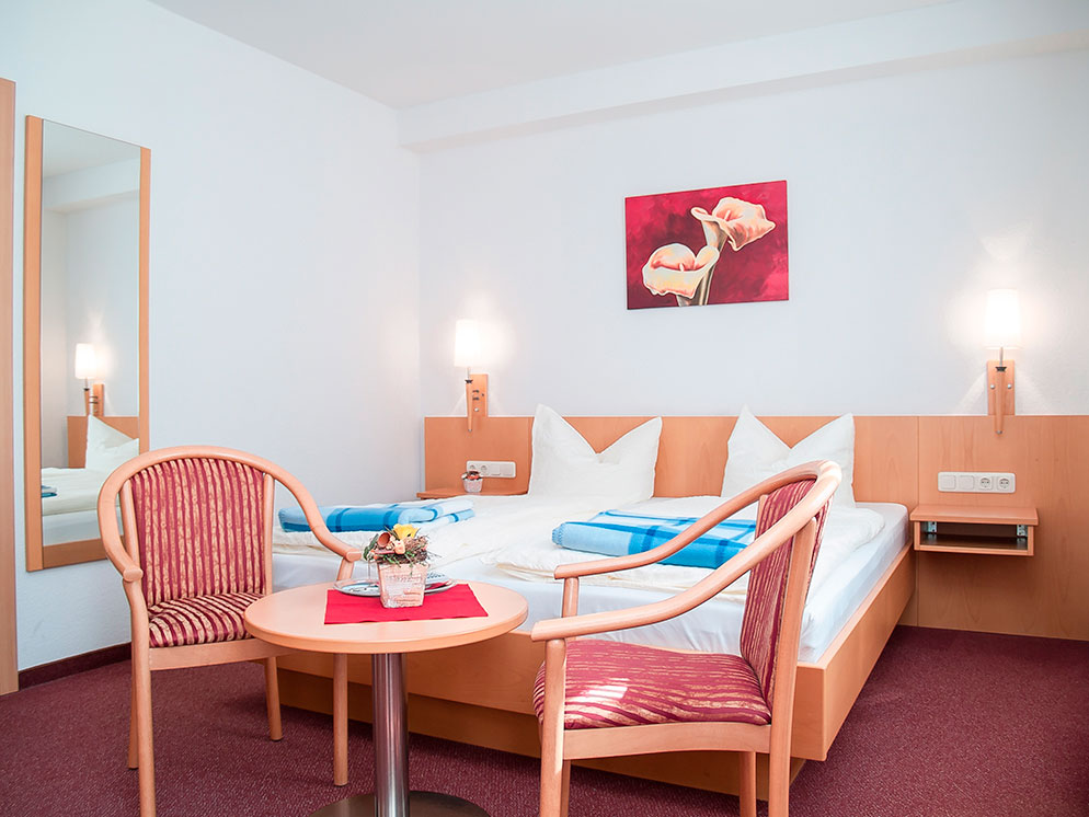 In unserer Pension bieten wir Ihnen gemütlich eingerichtete Doppelzimmer in unserem Gasthaus sowie einem direkt nebenan gelegenen Gästehaus an.